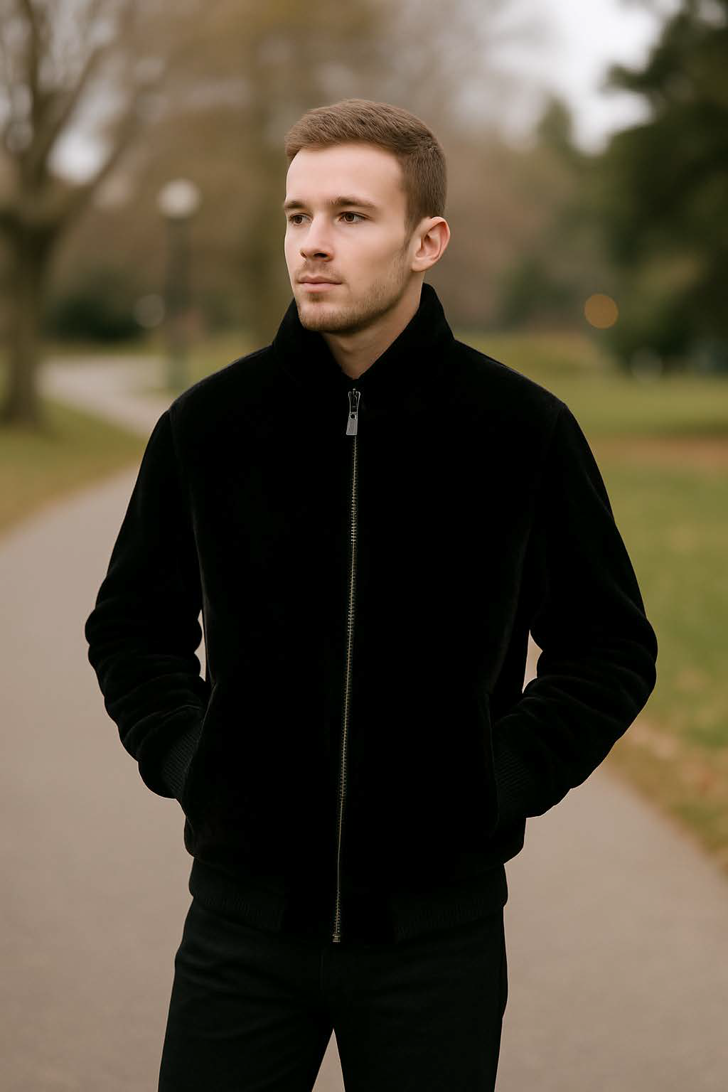 Men’s Black Faux Fur Zip-Up Bomber Jacket with out fleece